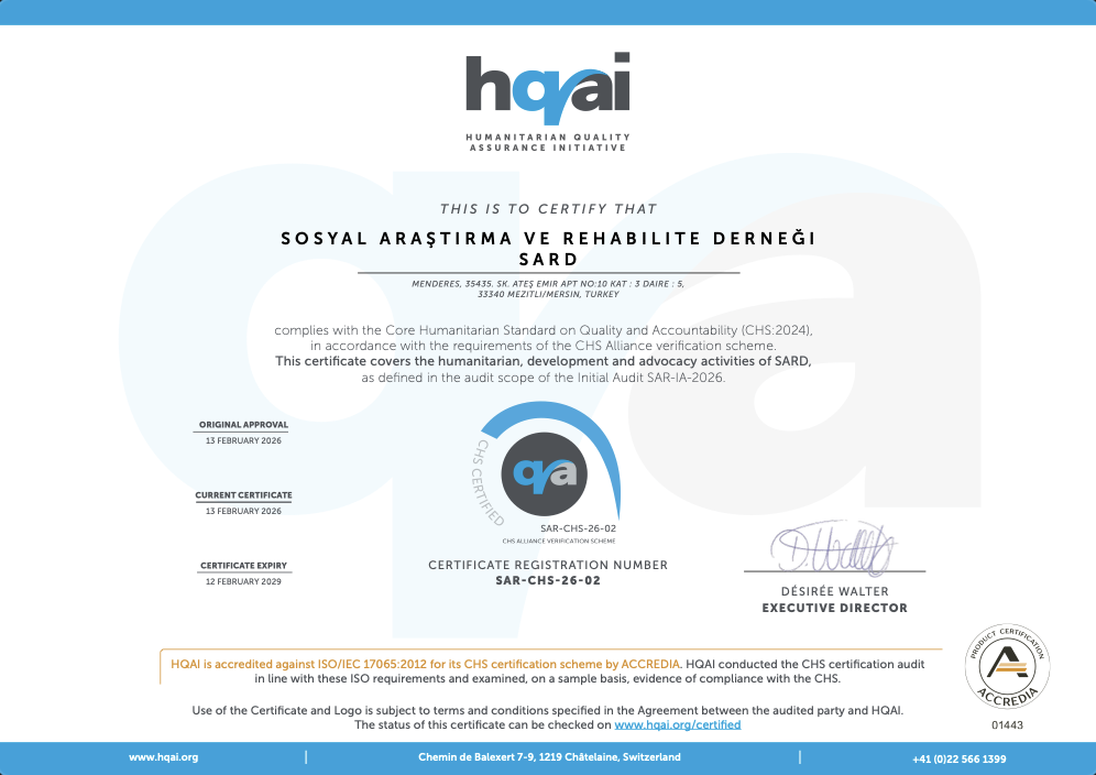 SARD is certified against the CHS for its humanitarian, development and advocacy mandates since 2026.