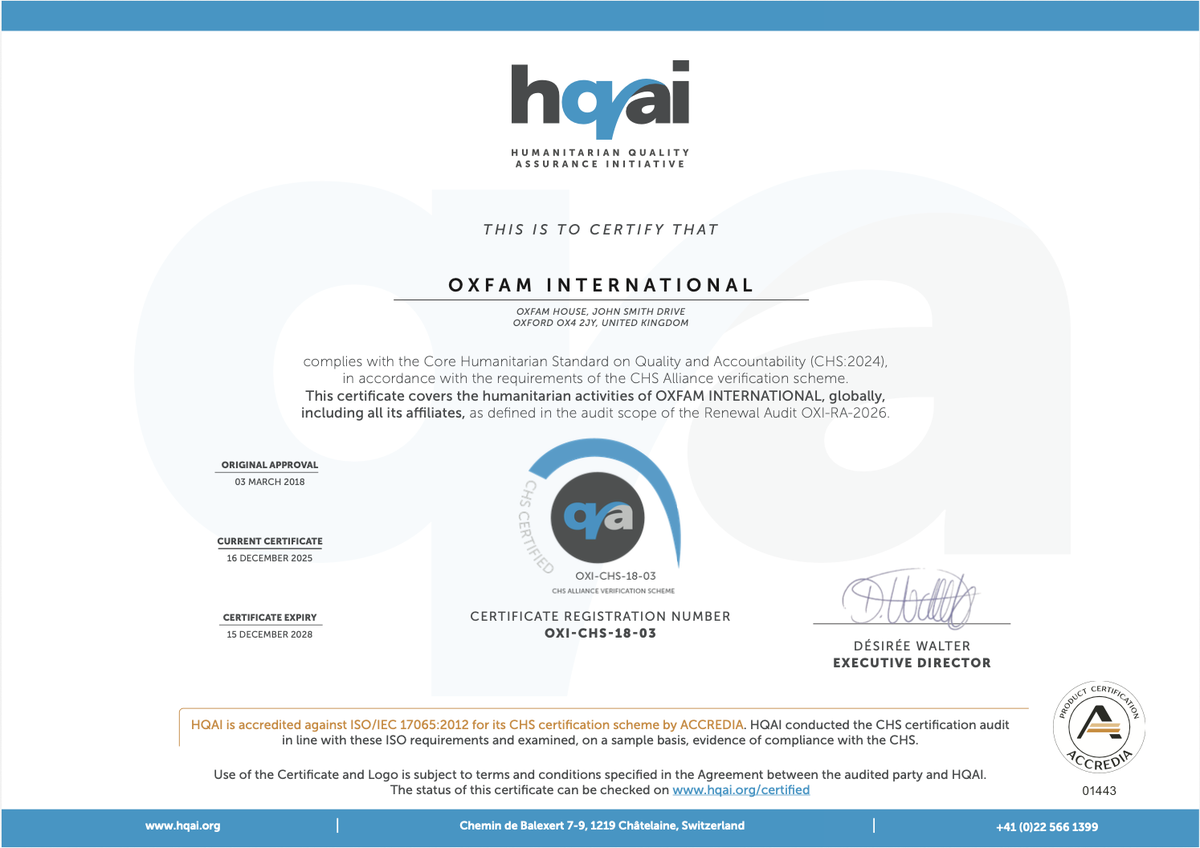 Oxfam International is certified against the CHS for its humanitarian mandate since 2018, globally, including all affiliates.