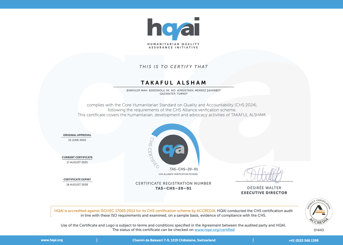 Since 2025, Takaful Alsham is certified against CHS:2024 for its humanitarian, develoment and advocacy mandates.