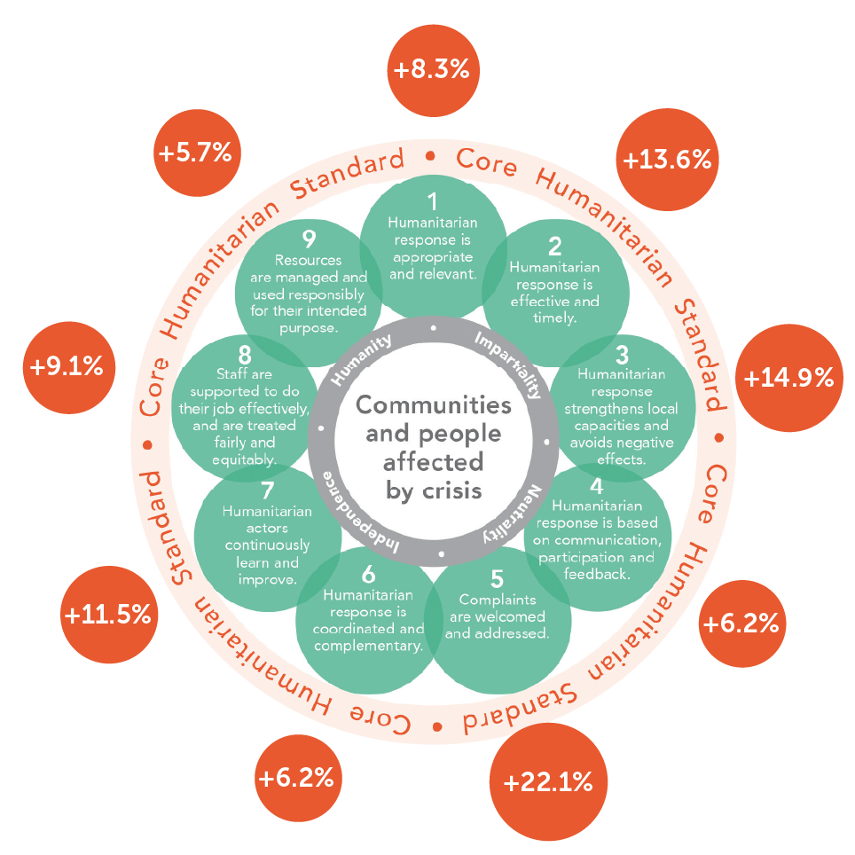Across the board, organisations improve their CHS scores between Initial and Renewal Audits. More importantly, audits lead aid actors to focus on weaker areas and achieve significant progress where it matters most.