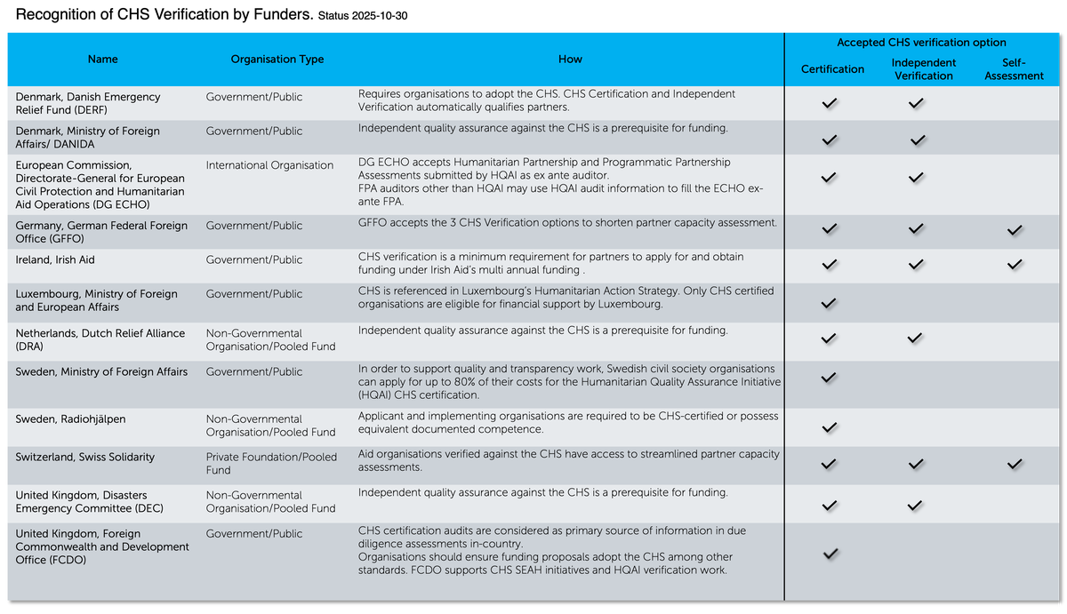 The CHS is a measurable standard that comes with three Verification Options: Self-Assessment, Independent Verification and Certification. The latter two are external audits provided by HQAI. An increasing number of funders endorse the CHS, request verification against it, and recognise CHS Verification in their due diligence requirements.